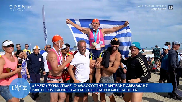 Αθήνα 23.11.2022. Η Κωνσταντίνα Δημοπούλου παίρνει συνέντευξη στην εκπομπή "Εμείς" (Open TV) από τον γηραιότερο Έλληνα αθλοσώστη, Παντελή Αβραμίδη, που σε ηλικία 81 ετών, παρά το μόνιμο μούδιασμα που του άφησαν οι χημειοθεραπείες λόγω καρκίνου, κατάφερε να σταθεί στα πόδια του, να προπονηθεί για αρκετά χρόνια και ως αποκορύφωμα να αγωνιστεί στο Παγκόσμιο Πρωτάθλημα Βετεράνων Ναυαγοσωστικής και να κατακτήσει το χρυσό μετάλλιο.